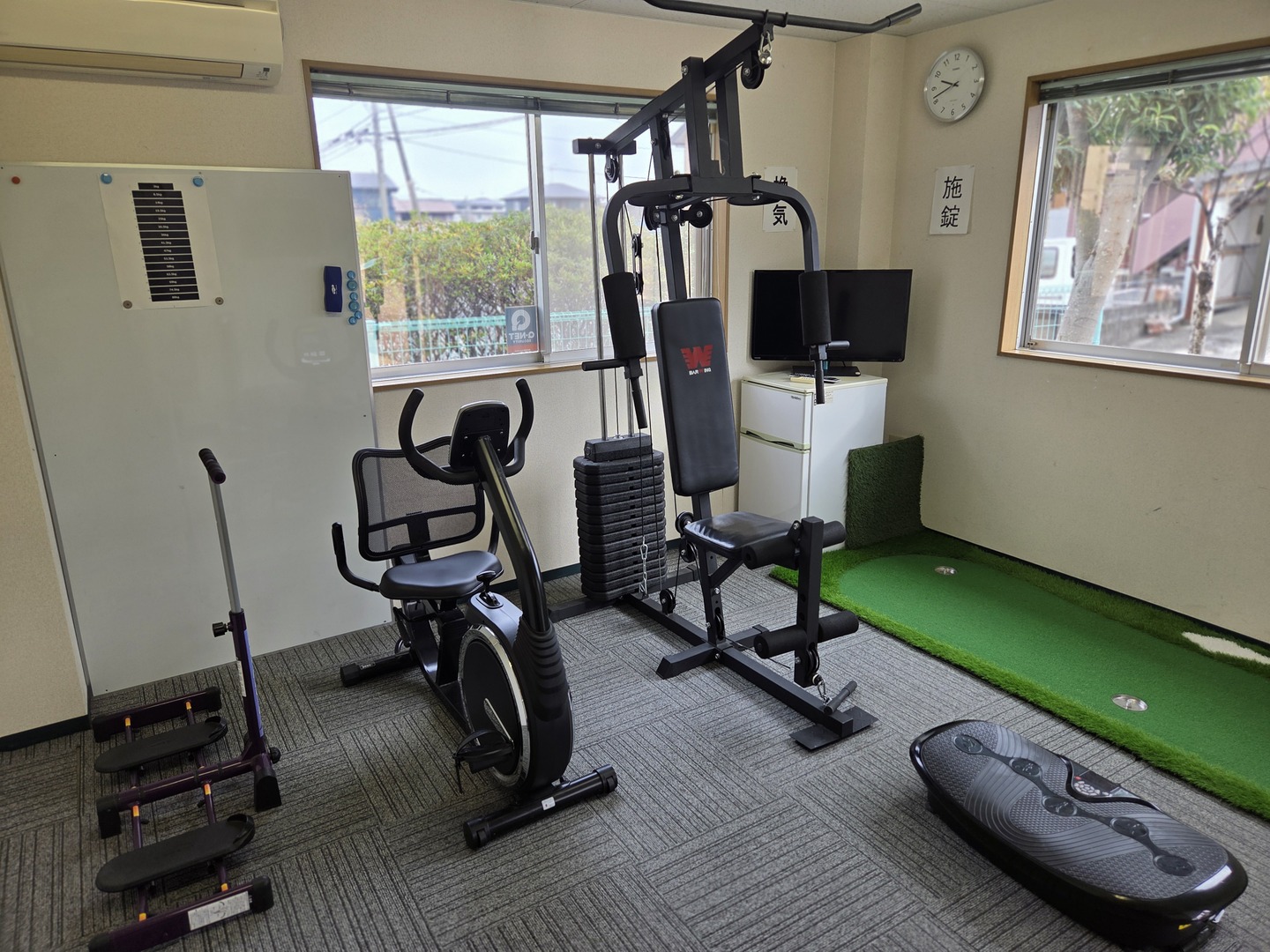ウエイトマシンやフィットネスバイクを完備し、従業員が自由に利用できるようになっています。