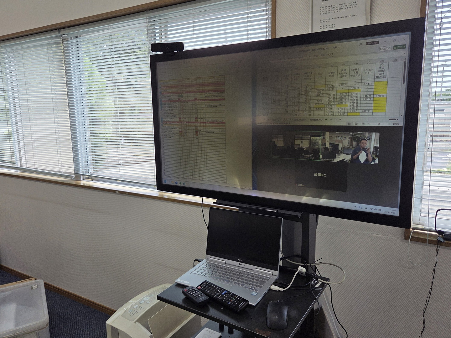 電子黒板を使用し、熊本本社・福岡営業所に関係なく、資料作成などの進捗状況を社員全員が確認できるようにしています。